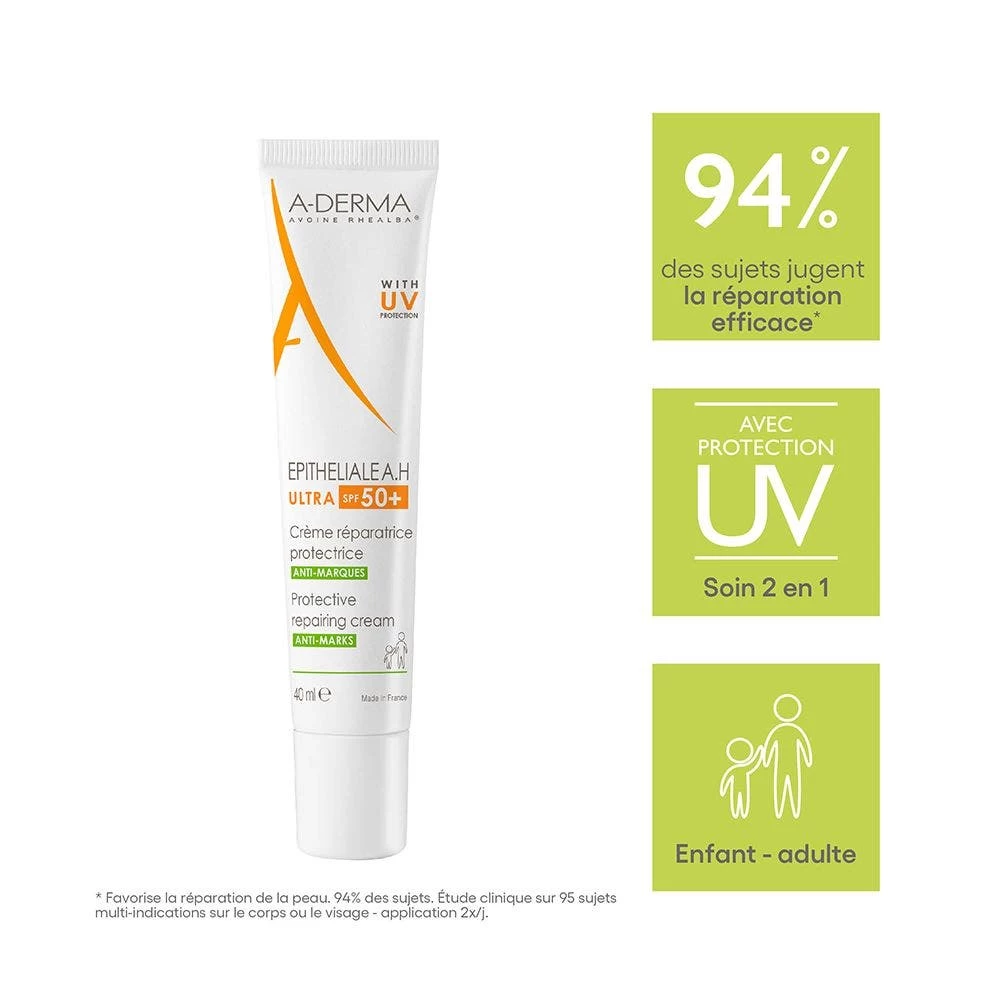 Basata su un complesso brevettato di CICAHYLUMIDE contenente 3 principi attivi: il dipeptide L-ALA-L-GLU, l’estratto di piantine di Avena Rhealba, un principio attivo vegetale naturale al 100%, l’Acido Ialuronico e un estratto naturale di Liana peruviana, EPITHELIALE A.H. ULTRA EPITHELIALE Cream aiuta a riparare la pelle riformando il suo film protettivo per promuovere la guarigione, ridurre segni e cicatrici, idratare profondamente per una pelle più liscia e lenire istantaneamente qualsiasi disagio. Questo prodotto dermatologico per la cura della pelle contiene anche un fattore di protezione SPF50+ per proteggere dai raggi UV. La pelle ritrova la sua elasticità ed è lenita. Ben tollerato, può essere utilizzato anche sulla pelle fragile dei più giovani.