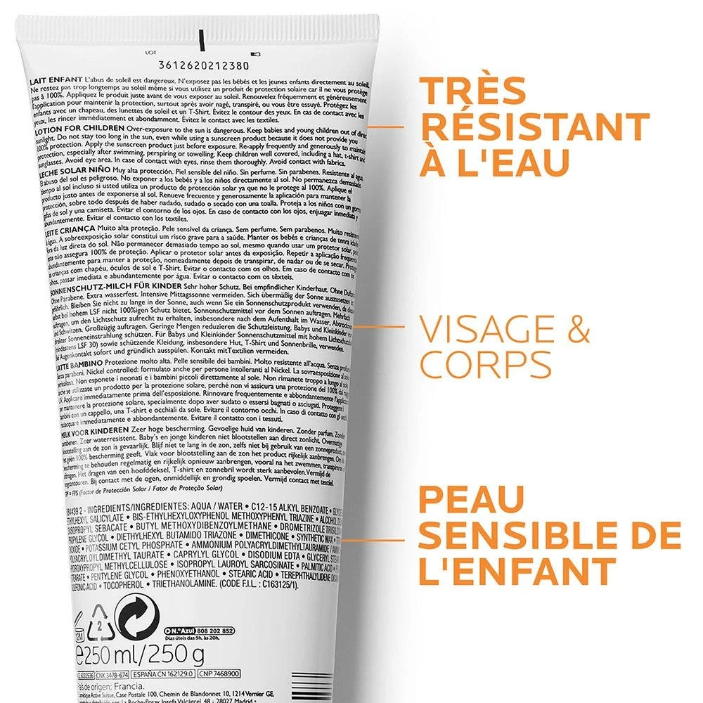 Offre una protezione molto alta SPF 50+ ad ampio spettro (UVA, UVB) per il corpo dei bambini.