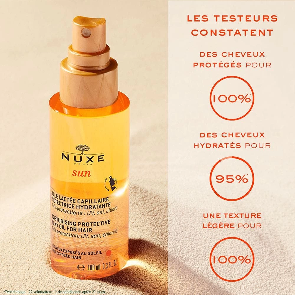 Il latte olio bifasico Nuxe protegge i capelli dai raggi UV, fornendo al contempo idratazione e lucentezza. Può essere utilizzato prima e durante il bagno (mare o piscina) per proteggere i capelli dagli effetti della salsedine e del cloro, proteggendo al contempo il colore.